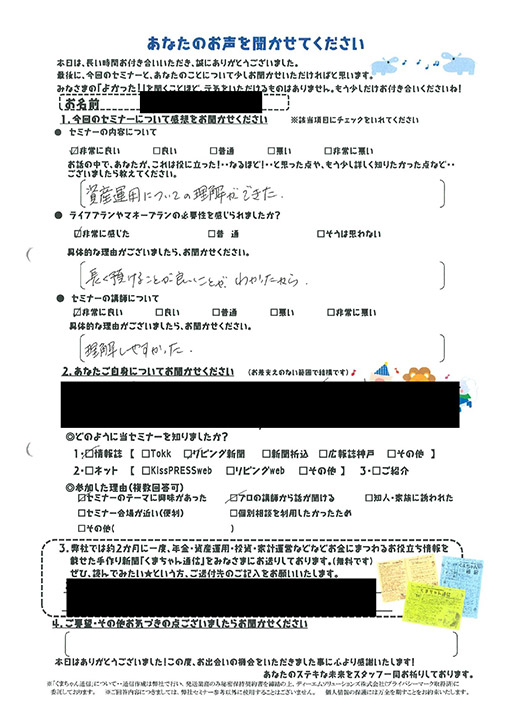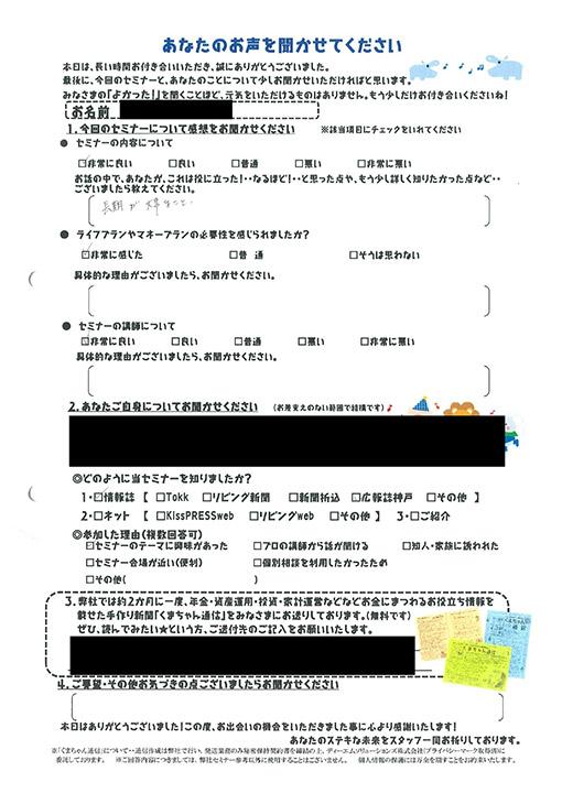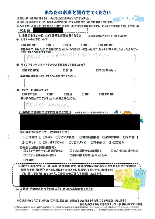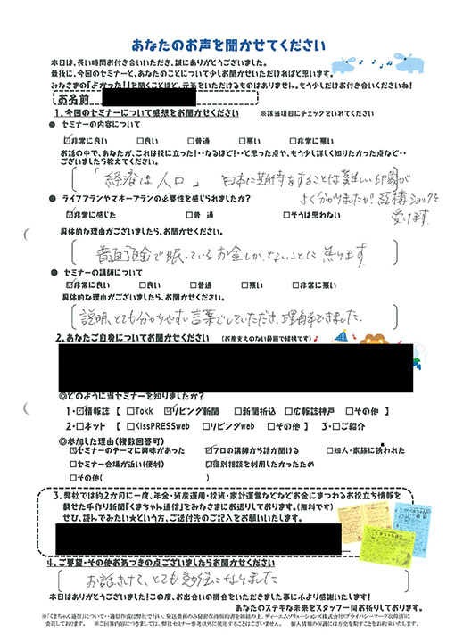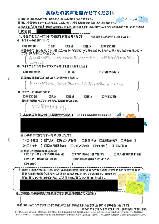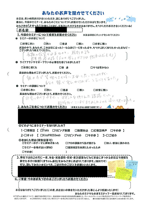 必要性を感じられたか非常に感じた。親の介護等が出てきた時に不安に思ってたのですが、自分+親で考えなければと気づきがあった。
